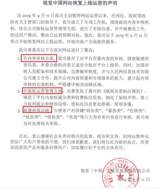 視覺中國公告稱,公司于 2019 年 5 月 12 日零點開始恢復(fù)網(wǎng)站上線運營,開始向客戶全面提供服務(wù)。