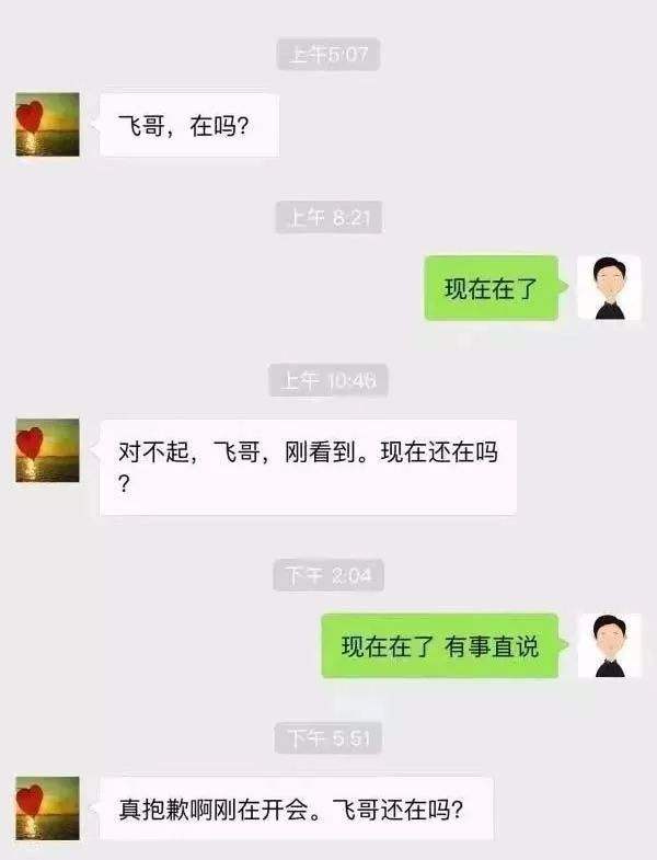 另一方面,當你問對方有什么事時,如果對方暫時不在,隔了一會兒,又會回復你,這下在了,你還在嗎?這樣一來二去,還沒說到正題時,你已經(jīng)崩潰了。