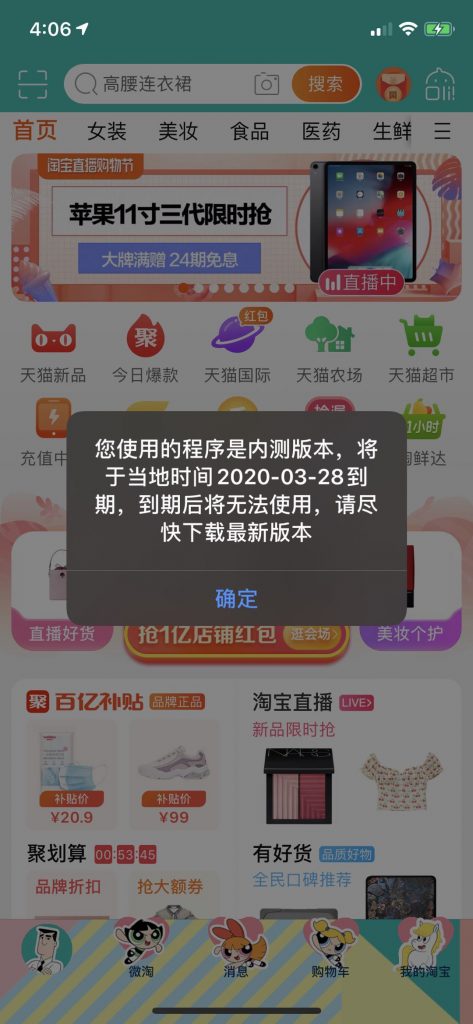 3月25日,手機淘寶iOS版本出現(xiàn)BUG,iPhone手機用戶打開淘寶APP后,會出現(xiàn)到期提示彈窗。彈窗顯示:您使用的程序是內(nèi)測版本,將于當?shù)貢r間2020-03-28到期,到期后將無法使用,請盡快下載最新版本。管道泵