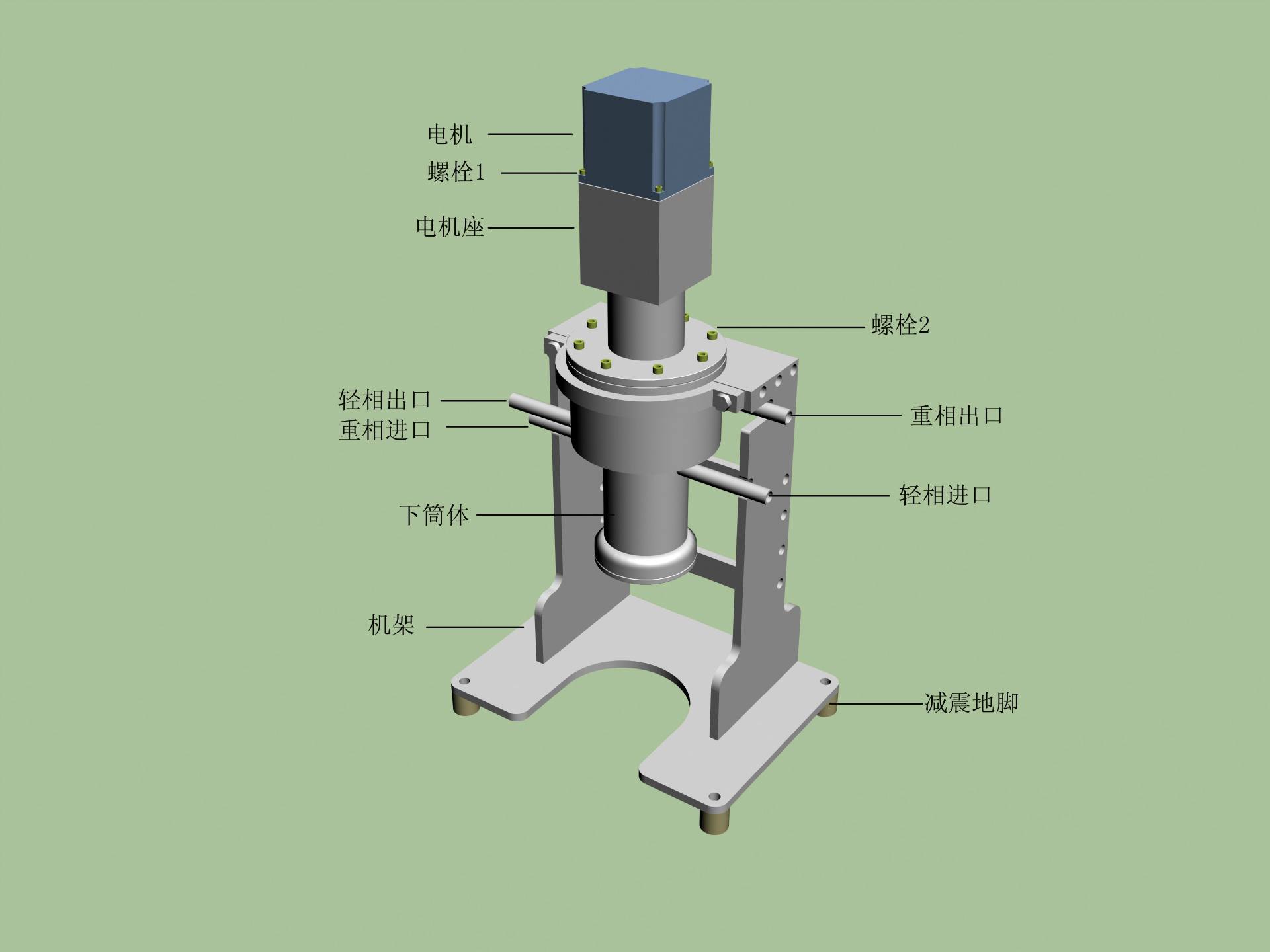 離心機(jī)之所以能夠?qū)崿F(xiàn)兩相液體的分離,是因為螺旋擋板在離心力的作用下能夠?qū)崿F(xiàn)歧管的平衡。 忽略溶液混合區(qū)和沉降過渡區(qū)的話,可以認(rèn)為螺旋擋板的左側(cè)是分層兩相液體,上層是醋酸丁酯,下層是水溶液,螺旋擋板的右側(cè)是水溶液。 由于同一離心力,兩側(cè)的材料因密度而產(chǎn)生液位差,實現(xiàn)兩液相的分開排出。